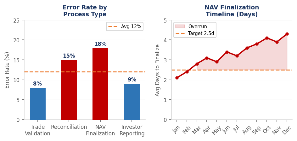 Operational diagnostics identified several structural weaknesses across the firm’s core processes. Error rates averaged approximately 12%, and NAV finalization frequently exceeded expected timelines. Backlog aging analysis showed a meaningful proportion of breaks exceeding 3-day resolution thresholds, increasing regulatory and counterparty risk exposure.