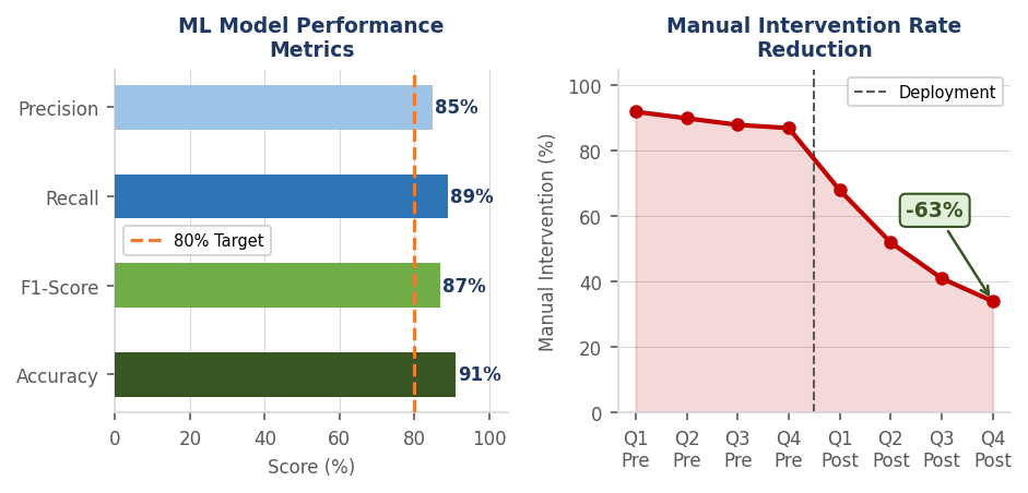 Average manual intervention rate declined from over 90% to 34% of transactions following full deployment. Operational teams shifted from manual data consolidation to exception-focused supervision.