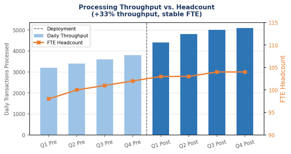 Operational cost per transaction declined as automation reduced manual review effort. Error-driven rework costs decreased significantly, while improved processing speed supported scalable portfolio growth without proportional operational hiring. Operational leverage improved as throughput scaled 33% while headcount remained stable. Modeled cost avoidance driven by reduced rework and productivity gains resulted in a strong payback profile following implementation.