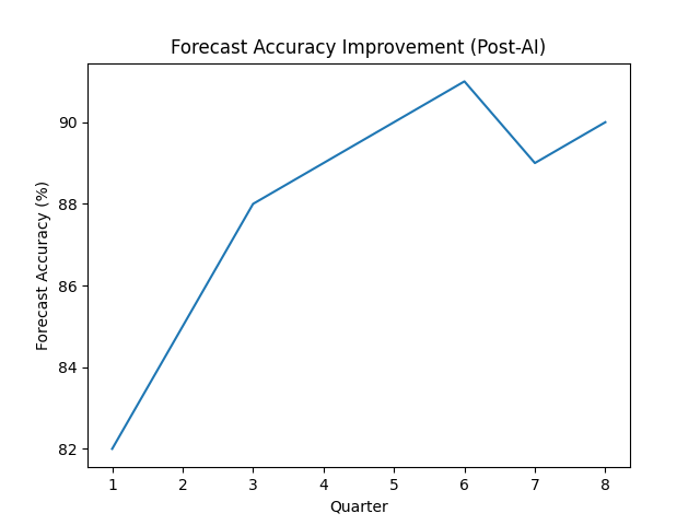 Forecast accuracy improved to 89.4%, reducing MAPE to 6.2%. Downside band width narrowed by 41%, enhancing forward supply visibility and contract reliability.